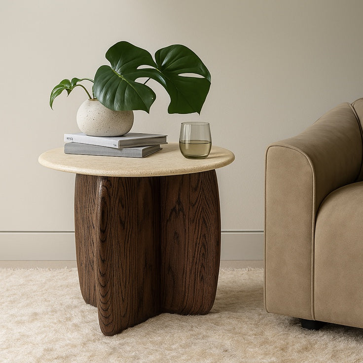 “The Mini Love Side Table - I wasn’t expecting to love this side table as much as I do, but it’s honestly such a nice touch in the room. The shape is super unique kind of like a rounded heart or a pebble and it adds a bit of personality without being too loud. The color is this deep reddish-brown that works really well with my green couch and the rest of the space”