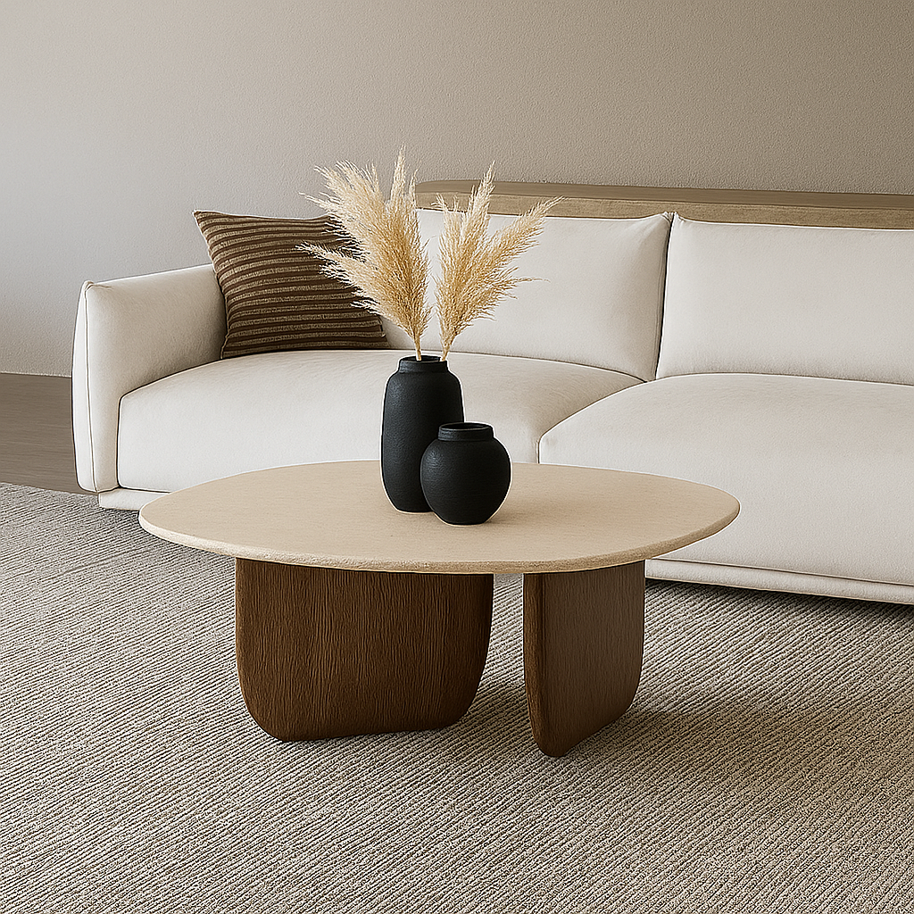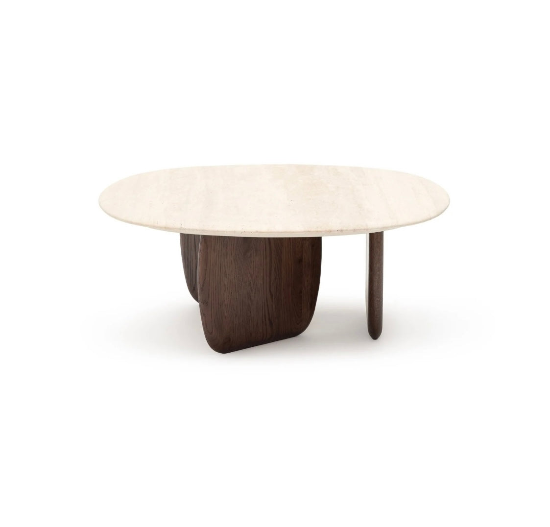 A sculptural statement in quiet luxury, this coffee table features a monolithic silhouette crafted from richly veined stone. Its low, elongated form exudes understated elegance, while the soft curvature of its edges adds a tactile warmth to the otherwise bold geometry.