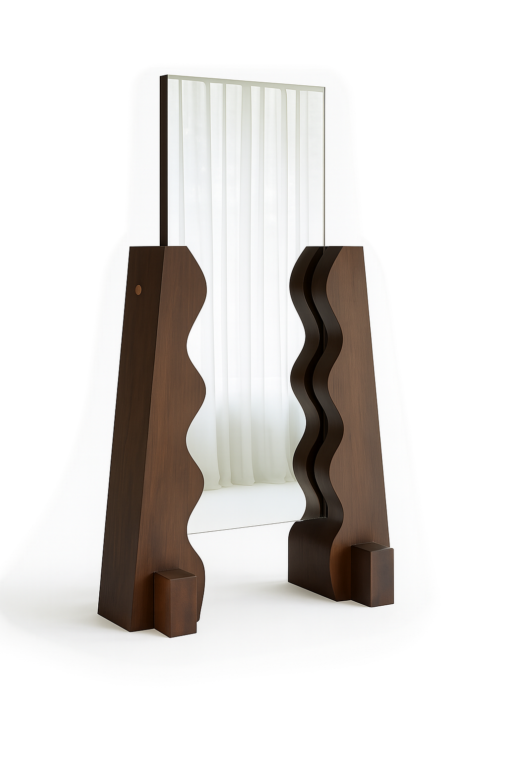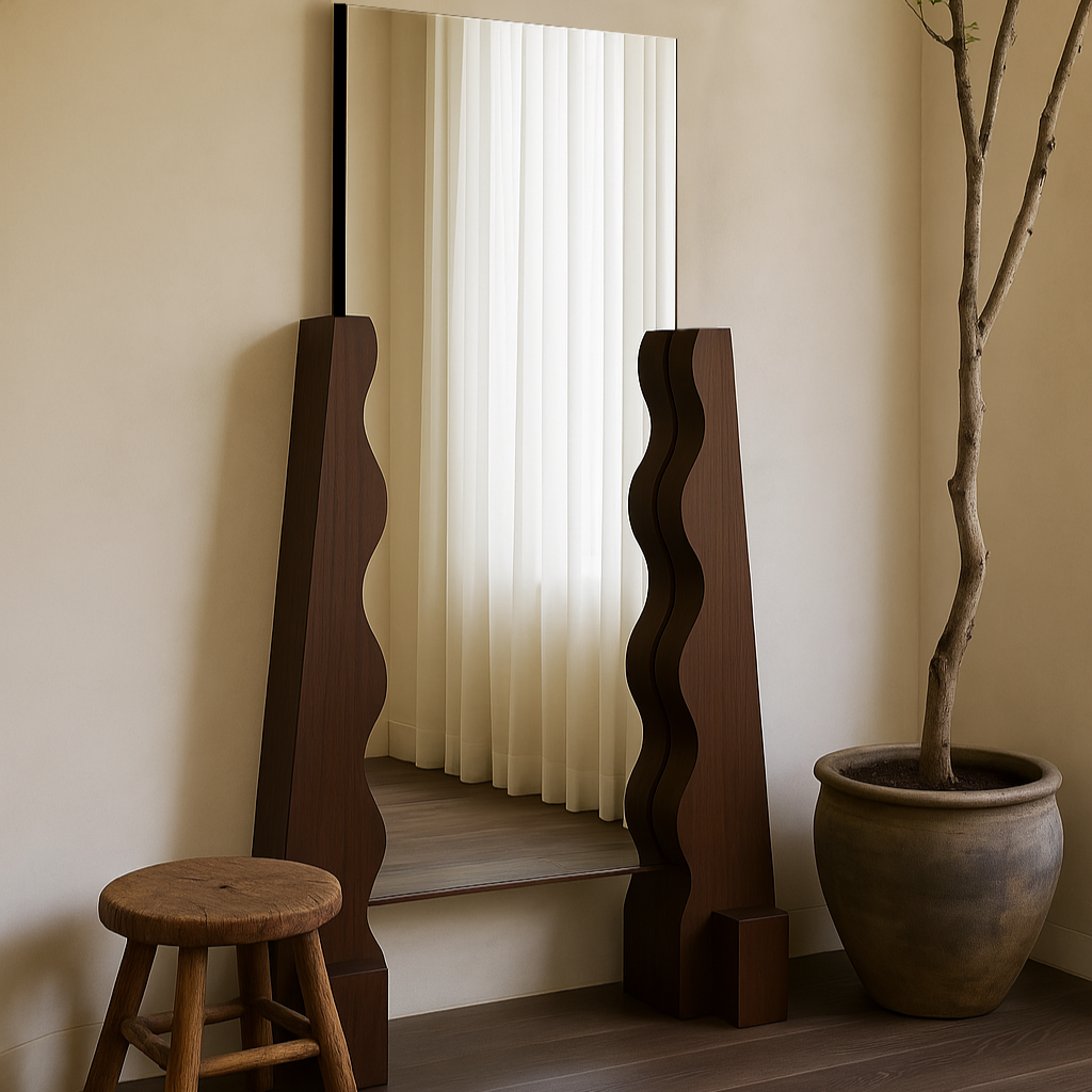 This mirror features a clean, rectangular plate and a dominant, curved wood frame, achieving a naturally inspired statement design.