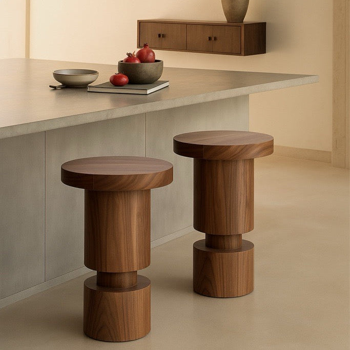 The Barrow Bar Stool stands like a chess piece—solid, sculptural, and confident. Carved from richly grained hardwood, its silhouette feels both classic and commanding. The