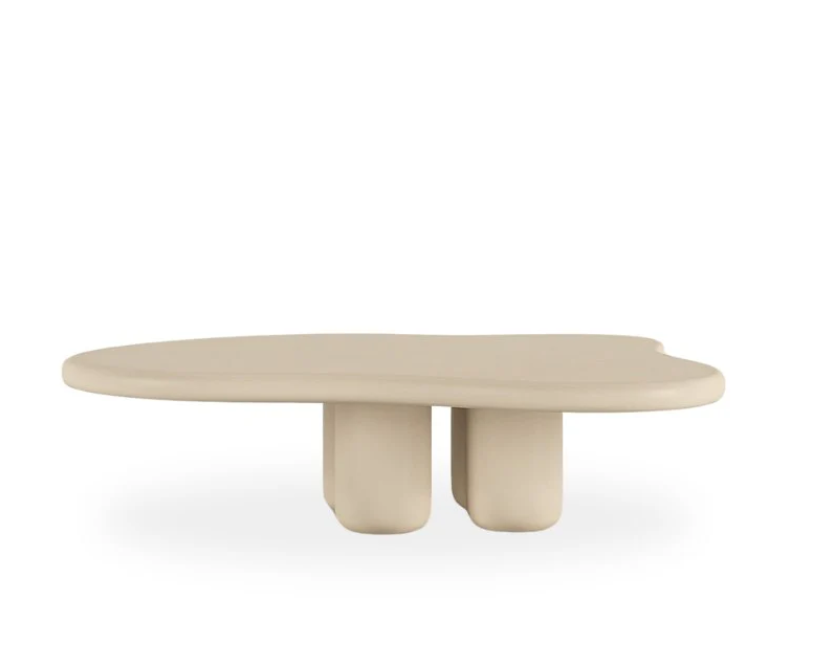 Its form is organic with fluid, rounded edges that resist traditional geometry, lending the piece a sense of visual softness. The legs are compact cylinders placed close together near the center, creating a sense of visual balance.