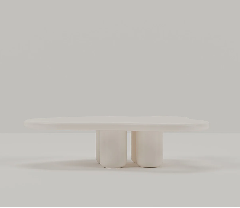 Its form is organic with fluid, rounded edges that resist traditional geometry, lending the piece a sense of visual softness. The legs are compact cylinders placed close together near the center, creating a sense of visual balance.