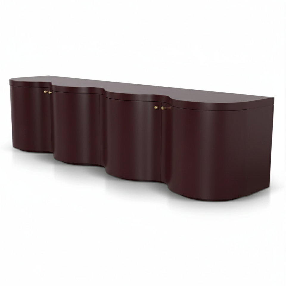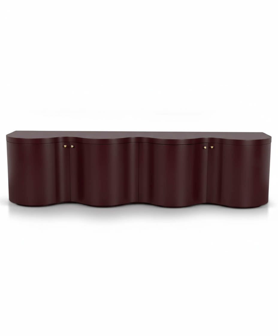 A low-profile console is defined by its striking, wave-like facade, a continuous, serpentine curve that gives it remarkable fluidity. It functions as a substantial storage unit, featuring four symmetrical cabinet doors marked by delicate, decorative brass-tone handles. The design is modern and luxurious, emphasizing smooth, continuous lines and a sleek, statement-making presence in any room.
