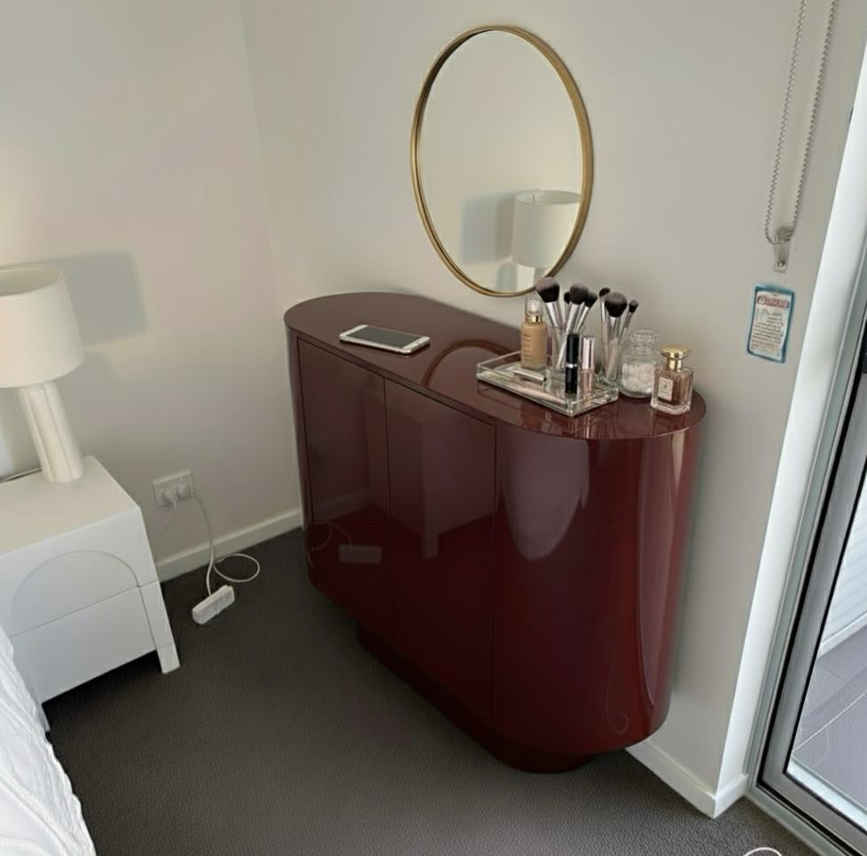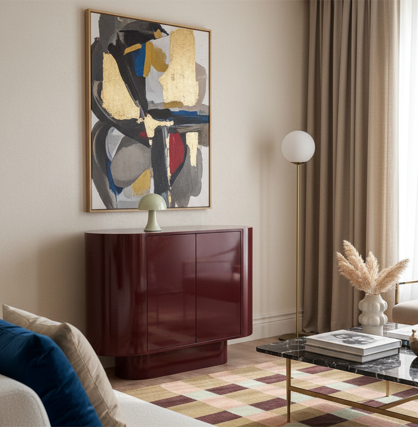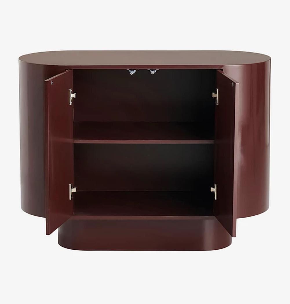 This rounded rectangular cabinet is finished in a deep oxblood gloss paint finish , catching light with a mirror-like sheen that shifts subtly throughout the day.