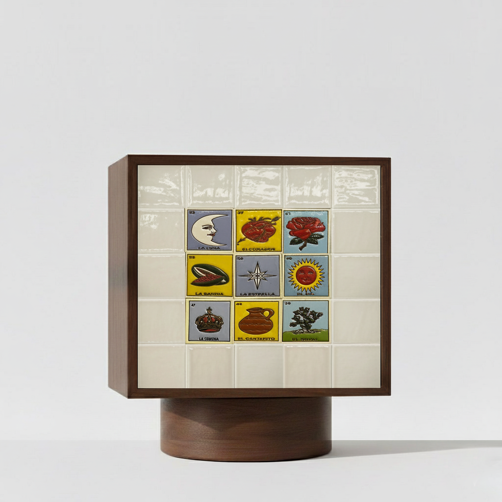 a one-piece tiled end table handcrafted in Mexico. Each curve and corner is wrapped in colorful ceramic tiles that celebrate Mexican artistry , bold, imperfect, and full of life