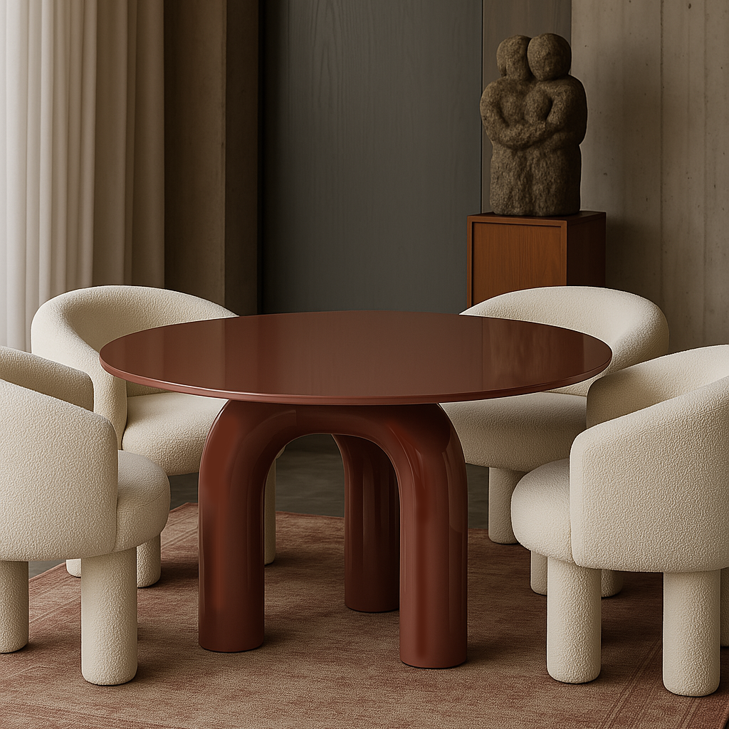 The curved legs add visual rhythm and architectural interest, while the circular tabletop invites connection from every angle.