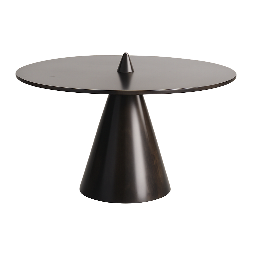 Defined by its tapered pedestal base and the subtle repetition of conical geometry, the Dining Table embodies minimalist elegance. A soft matte finish enhances its sculptural form, while the central cone accent introduces a refined rhythm, echoing the base and anchoring the composition with visual harmony.