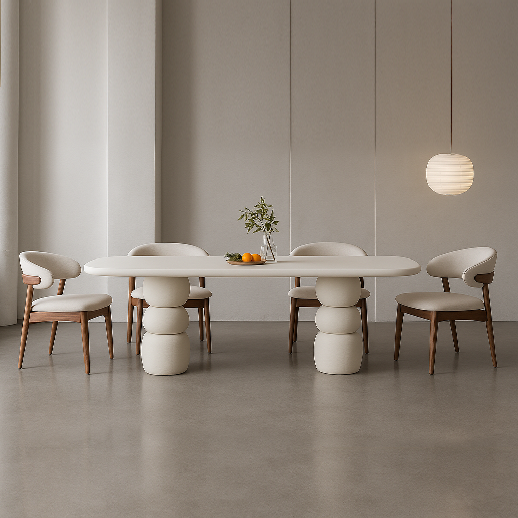 Features a pill-shaped top that softens any space with its gentle curves. Its signature bas sculptural legs made from perfectly stacked spheres creates a sense of rhythm and whimsy, making it a statement piece from every angle.