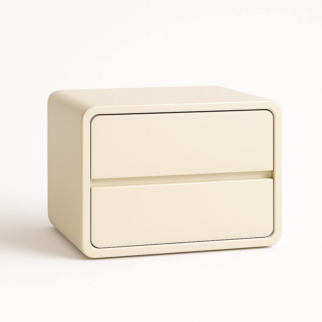 Its two-drawer design, softened by rounded edges and a handle-free profile, creates a minimalist rhythm that’s both functional and sculptural.