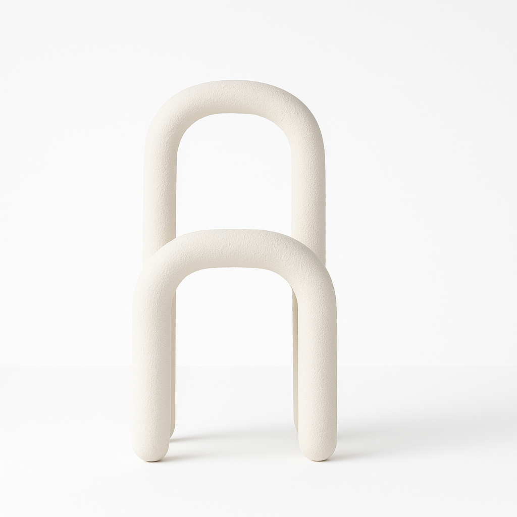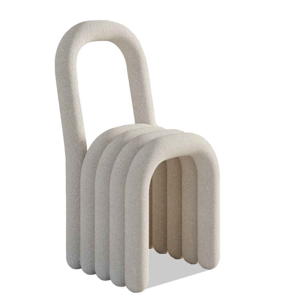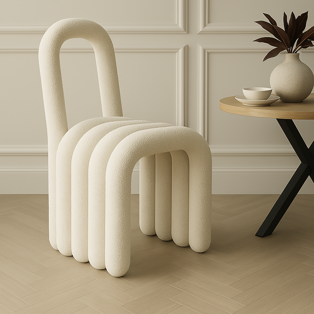 Its tubular silhouette, upholstered in soft off-white fabric, offers a tactile experience that’s both inviting and visually arresting. The continuous curves evoke a sense of fluidity, while the grounded proportions ensure comfort and stability around the dining table. Ideal for minimalist or art-forward interiors, this chair adds a touch of sculptural serenity to everyday rituals.