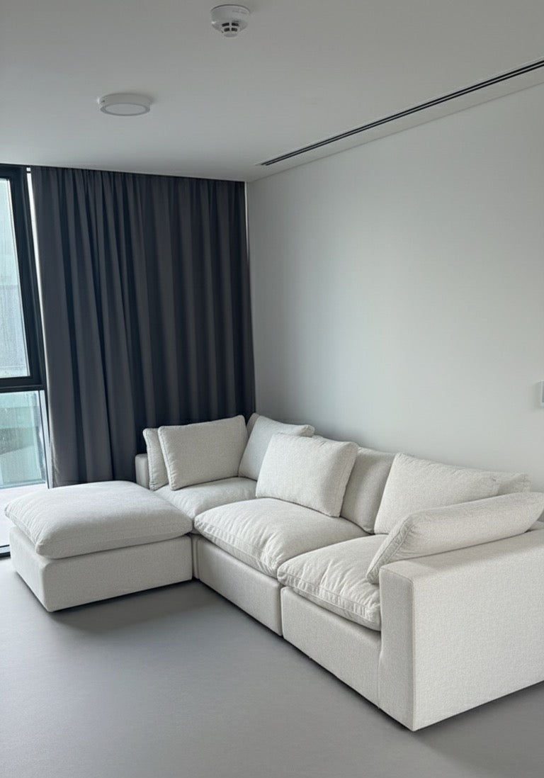 Upholstered in crisp off-white fabric, its clean lines and plush cushions create an inviting, airy feel perfect for any contemporary living space. The deep seats and generously stuffed backrest pillows provide ultimate coziness, while the modular design makes it versatile enough to fit large or compact rooms. Minimalist yet luxurious, this sofa is the statement piece your home deserves.