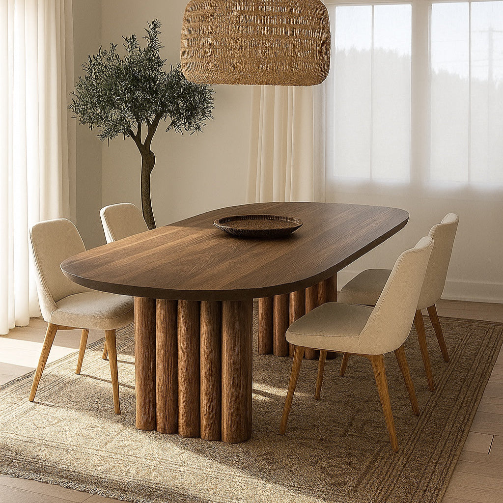 A sleek, oval-shaped table crafted in rich, natural wood. The top surface is smooth and elegantly elongated, showcasing subtle grain patterns. Its most distinctive feature lies in the leg design, two sculptural clusters of vertical cylindrical columns grouped together on either end.