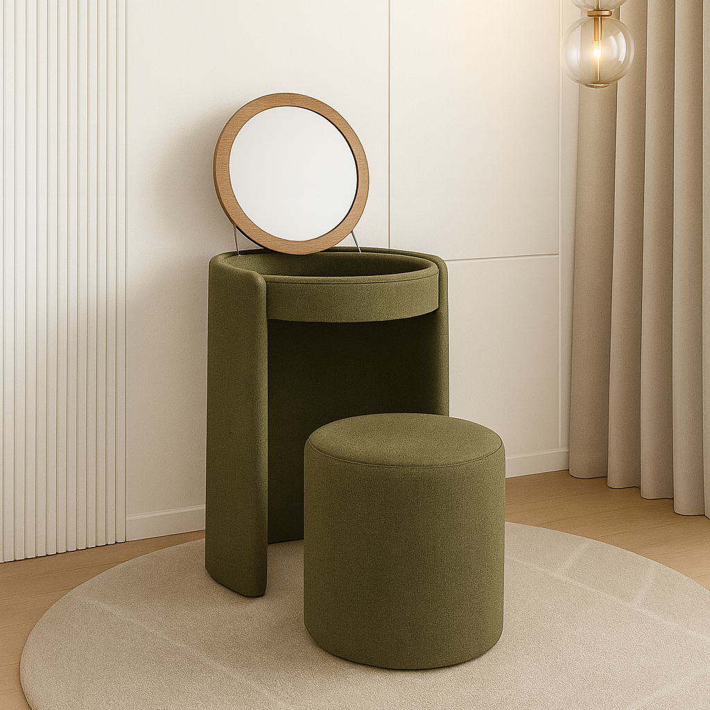 The matching stool nests seamlessly beneath the open base, preserving spatial clarity while adding tactile richness. Compact yet expressive, this vanity blends form and function, making it ideal for bedrooms, dressing areas, or boutique interiors seeking serenity and understated elegance.