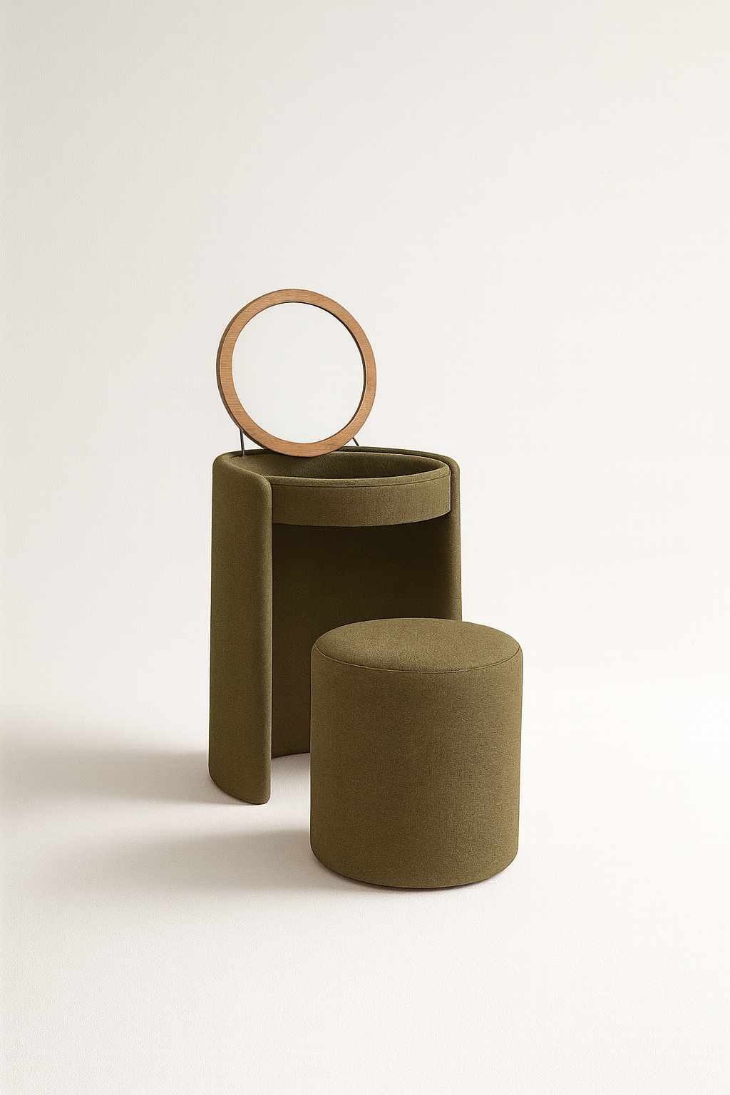 The Vanity Set is a refined expression of quiet luxury, designed to elevate everyday rituals with softness and sophistication. Featuring a circular silhouette, it pairs a hinged round mirror framed in natural wood with a hidden storage compartment for treasured essentials.