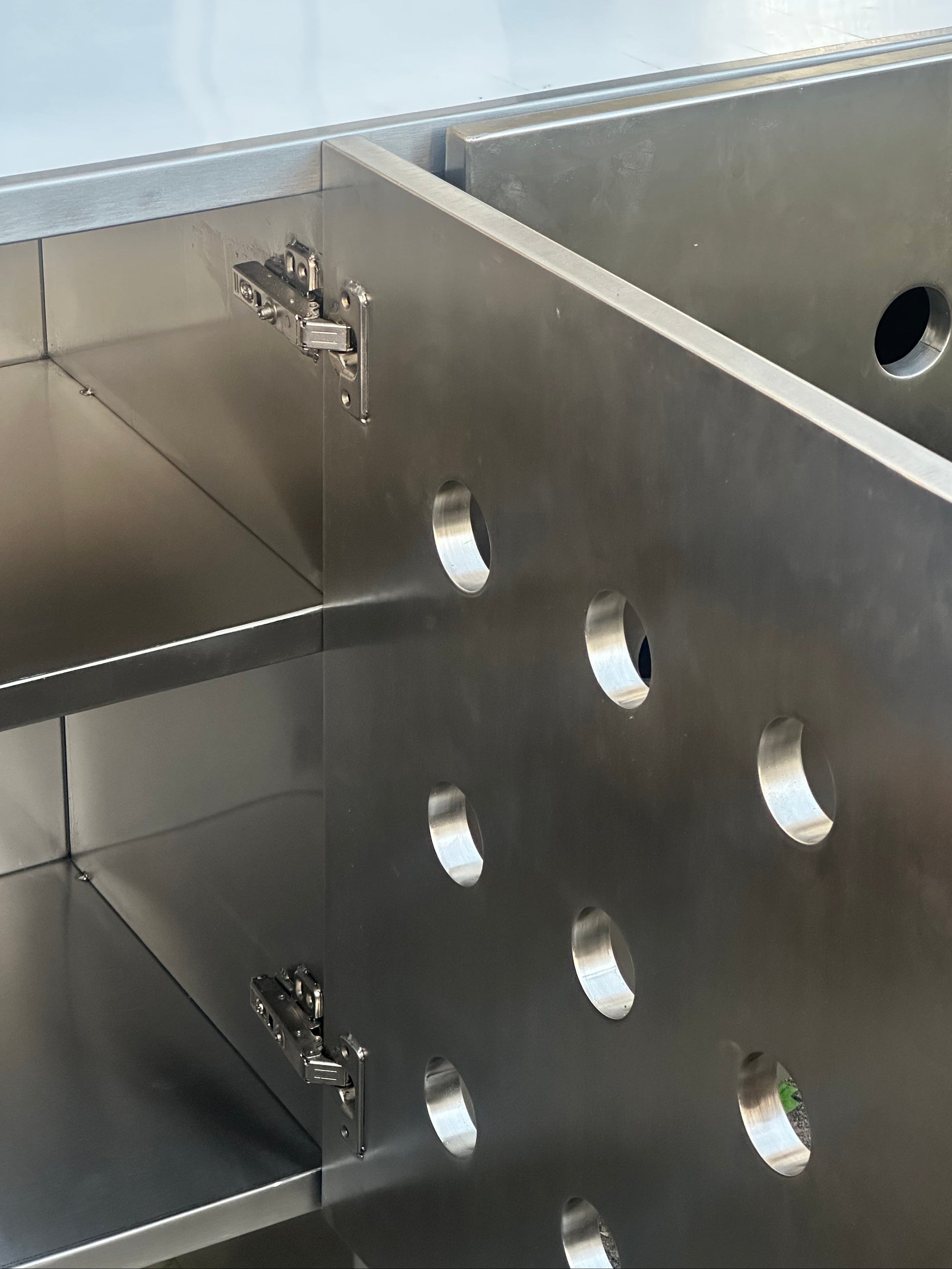 This is a modern, industrial-style sideboard featuring a sleek, rectangular shape in a stainless steel brushed finish. The most distinctive elements are the uniform pattern of large, circular perforations on their doors, giving a heavy yet visually light, caged, or dot-matrix appearance.