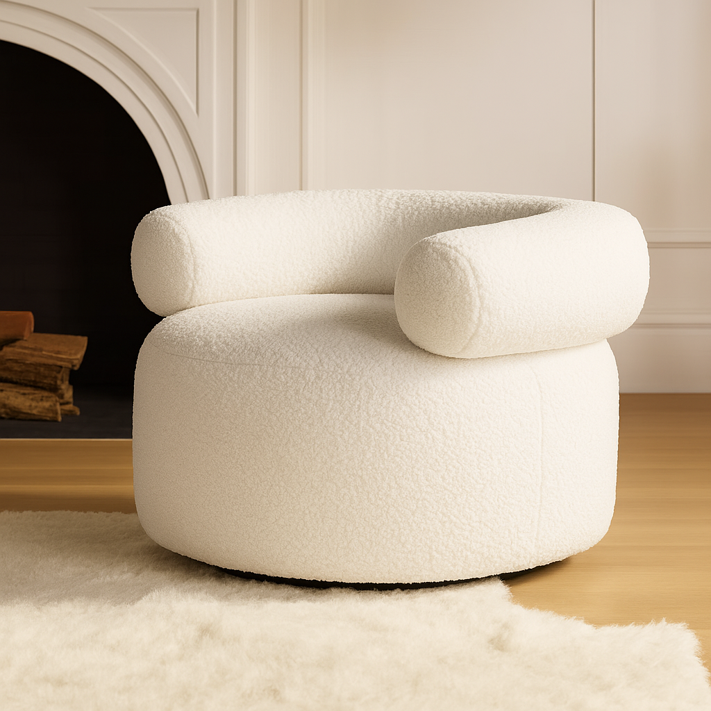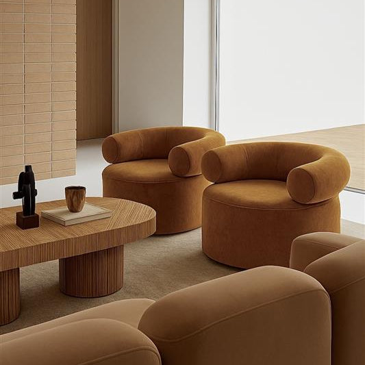 Strikes a balance between warmth and modernity. The integrated backrest and armrests form a continuous, enveloping shape that invites comfort while making a strong visual statement.