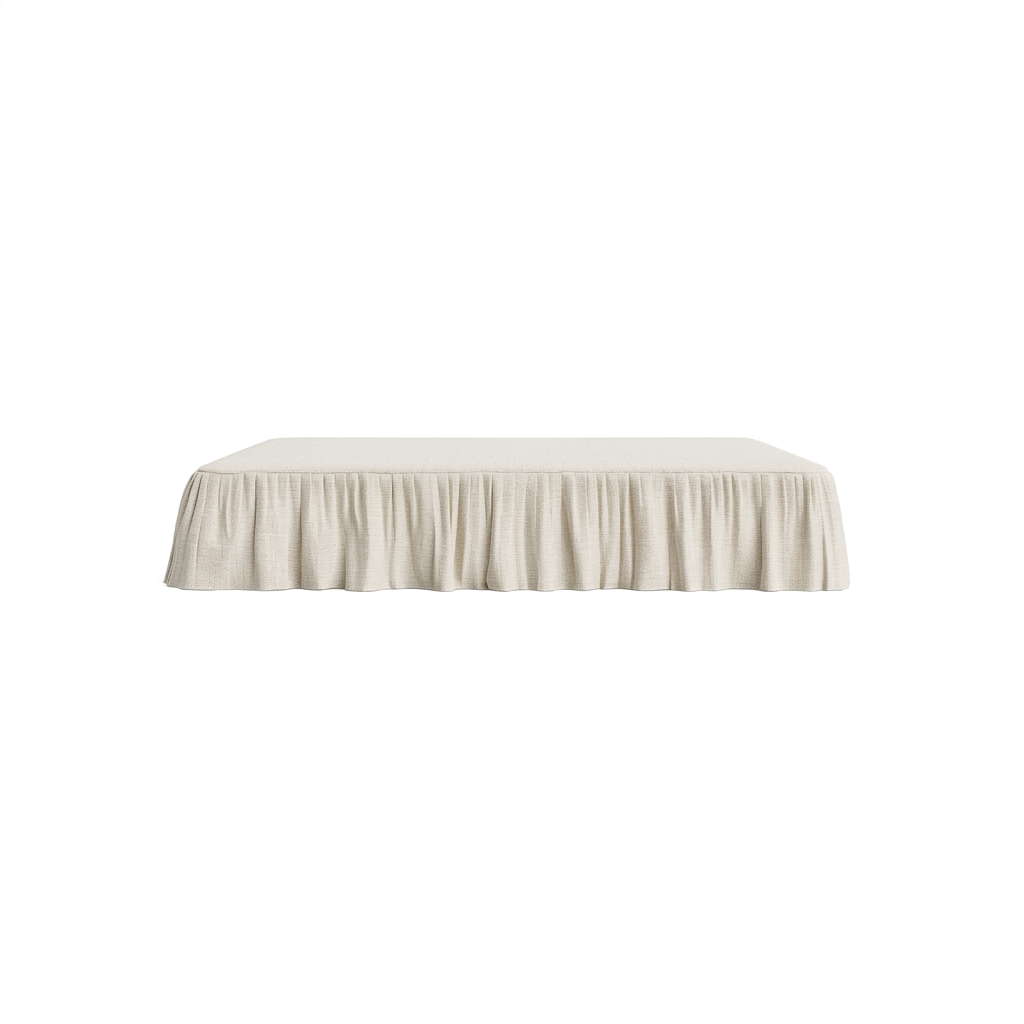The bed base is defined by a deep, floor-length skirted ruffle that completely conceals the frame. Rather than a rigid or upholstered surface, it utilizes a heavy gathered technique to create dense, vertical pleats that add a sense of movement and volume.