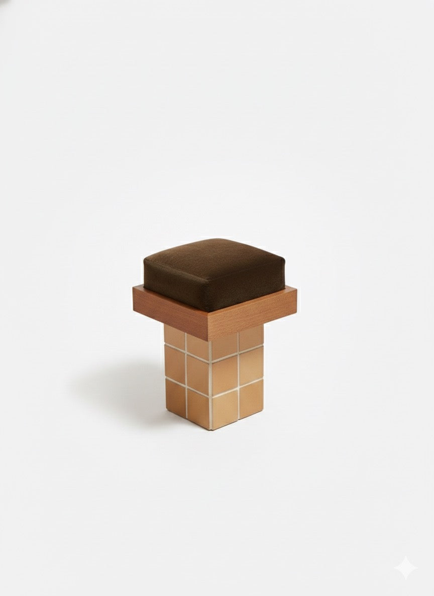 A feature ottoman with tiled base and crisp grout lines, creating a clean grid that emphasizes geometric order. Its solid base gives a anchored visuals.