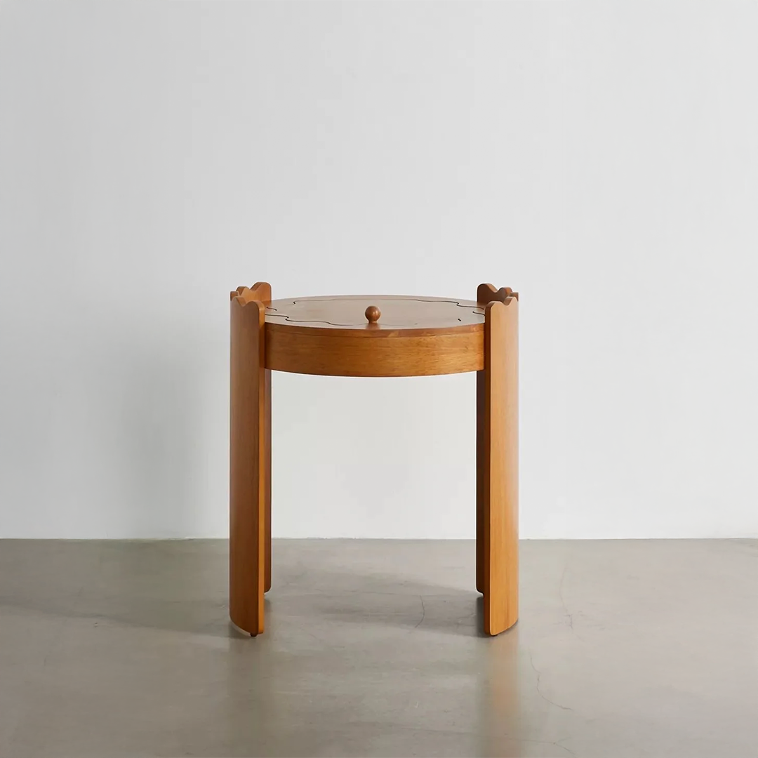 Handcrafted from warm-toned solid wood, its scalloped silhouette evokes softness and symmetry, echoing floral motifs and sunburst forms with a contemporary twist.