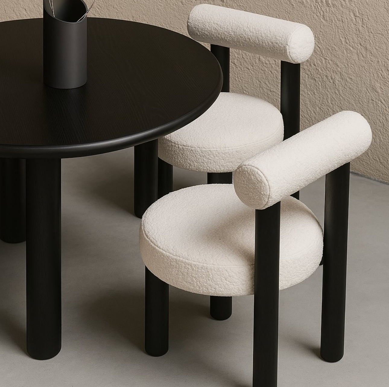 - Finish: Available in black wood with Boucle or fully upholstered Boucle