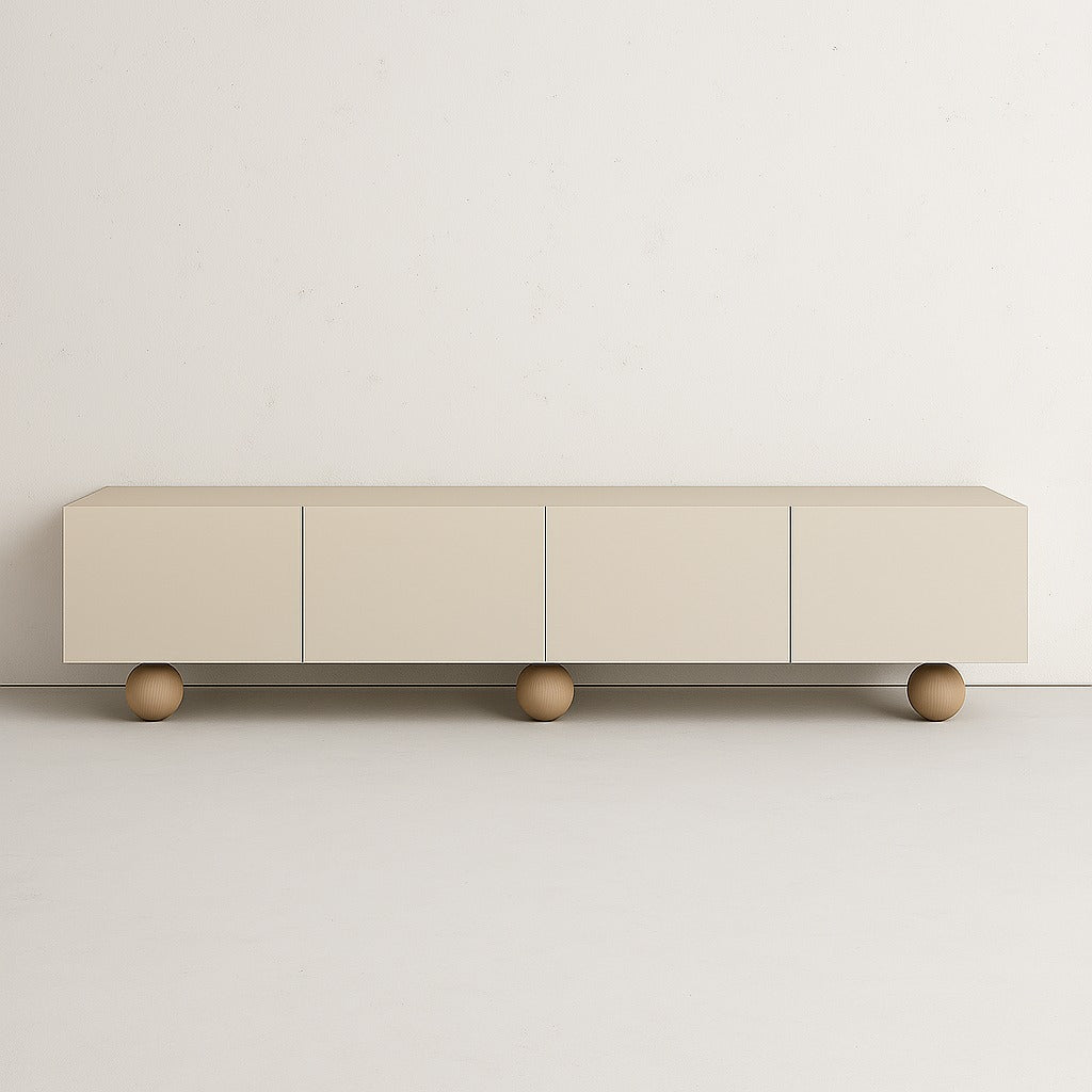 A striking blend of minimalism and sculptural detail, the Silo TV Unit features a sleek rectangular top, balanced effortlessly on a distinctive ball-like base.