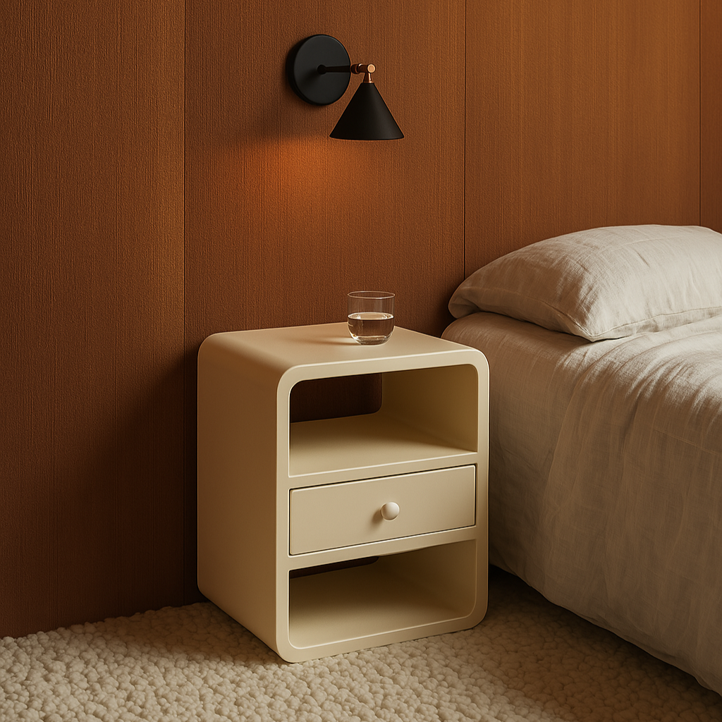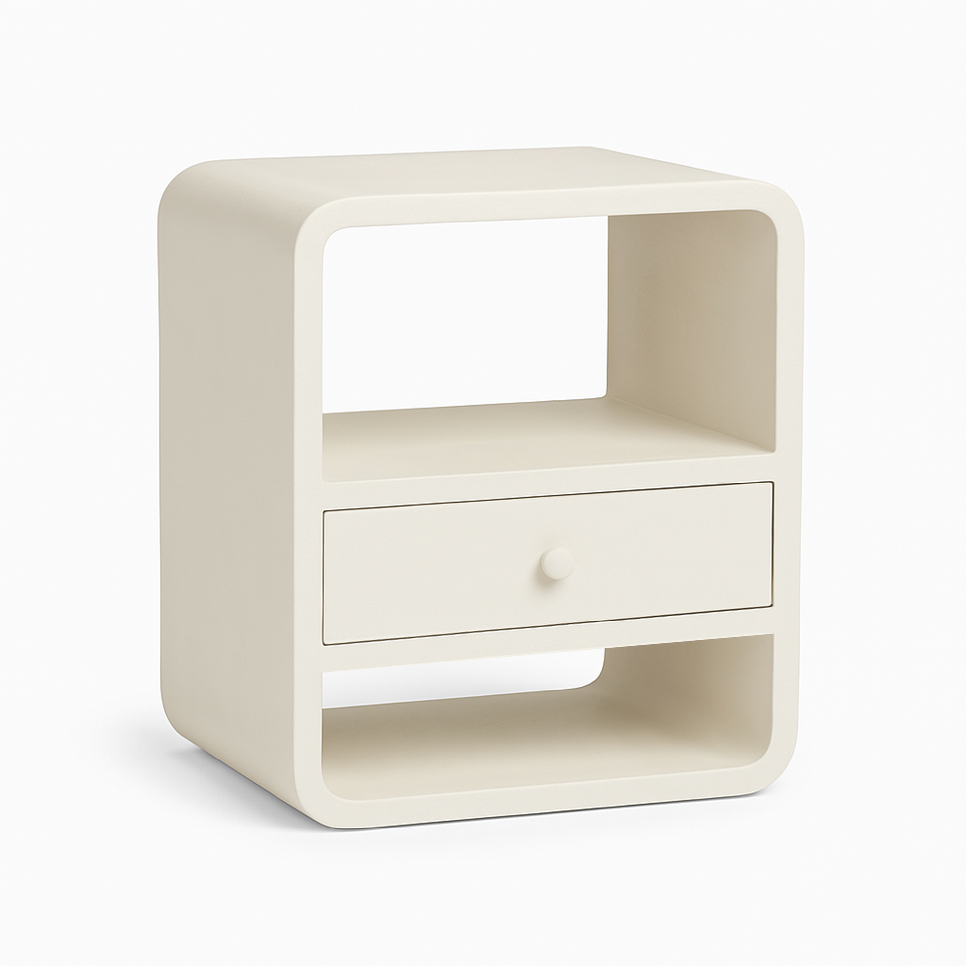 Milo whispers simplicity with intention. Its rounded rectangular form, finished in a soothing cream tone, hosts a balanced trio of storage zones, a top shelf for easy access, a central drawer with a subtle knob for private keepsakes, and a lower shelf for layered styling.