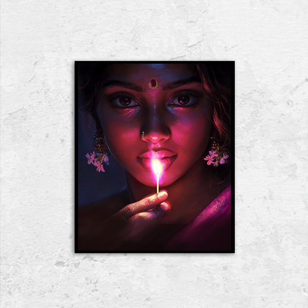 A striking composition measuring 50 cm x 70 cm, designed to command presence yet blend seamlessly into sophisticated interiors. The matte finish enhances the depth of shadows and the subtle interplay of light, creating an almost ethereal softness. Every detail, from the flicker of the matchstick to the whisper of smoke curling against the darkness, is accentuated by the refined texture, allowing for an immersive visual experience free from glare. Its scale makes it a statement piece, inviting contemplation and conversation, while its subdued finish ensures an elegant, timeless appeal.