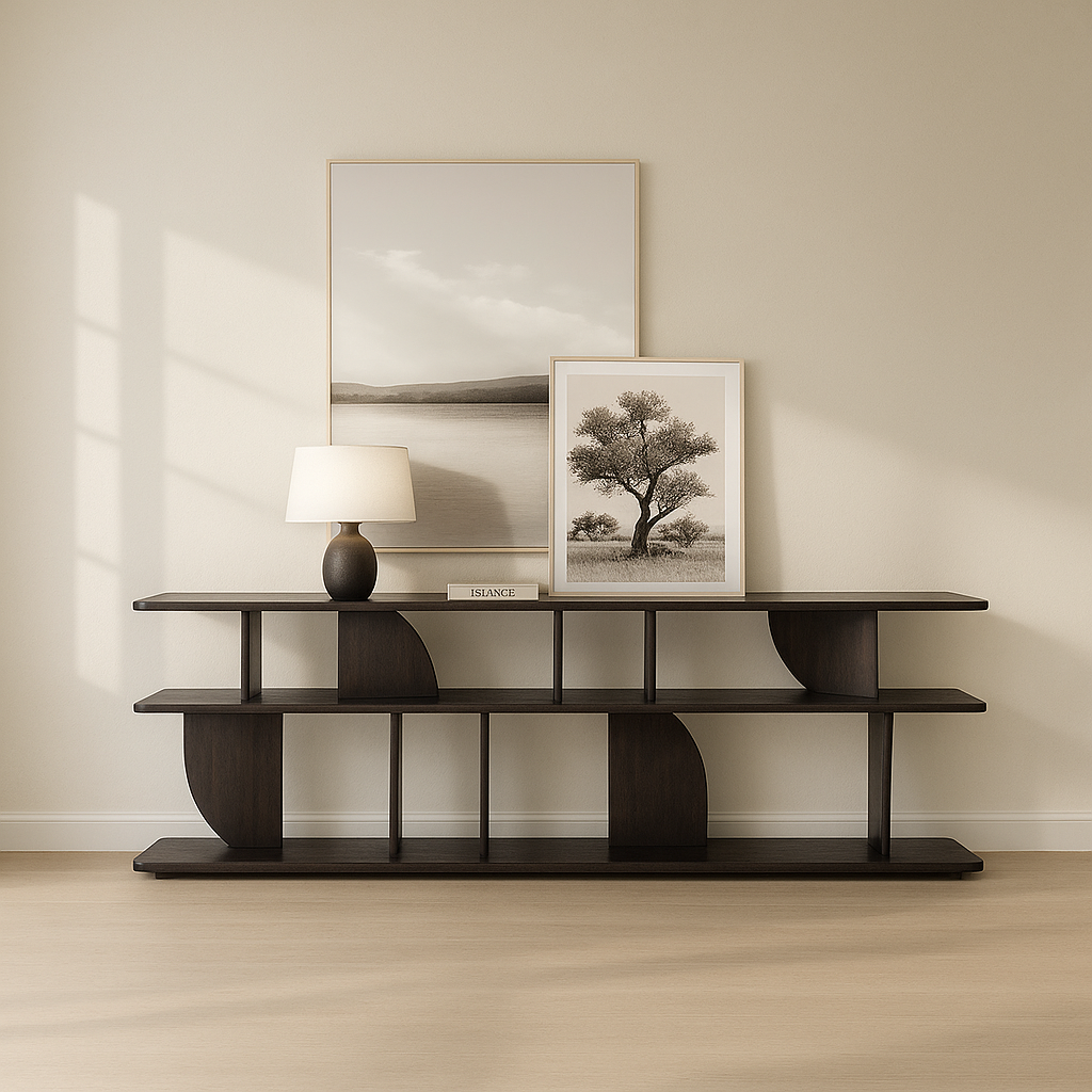 A modern sculptural shelf crafted in dark wood, composed of three open horizontal surfaces. & the vertical supports ,structured with an artistic rhythm of geometric forms, including half-circles and rectangles.